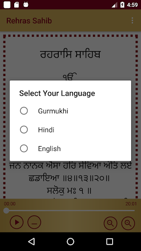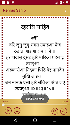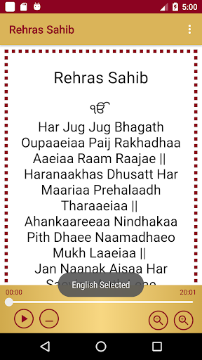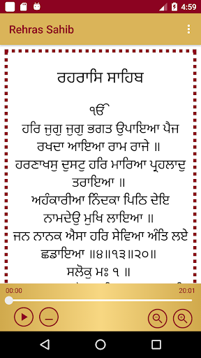 This app is a collection of hymns of five Sikh Gurus: Guru Nanak Dev, Guru Amar Das, Guru Ram Das, Guru Arjan Dev and Guru Gobind Singh. This app allows to read Rehras sahib path in three different language punjabi, hindi and english with Audio. Purpose of this app is to let busy and mobile young generation reconnect with Sikhism and Gurubani by reading path on gadgets like mobile and tablets. Lifetime free download very easy to use and zoom in or out option while reading .