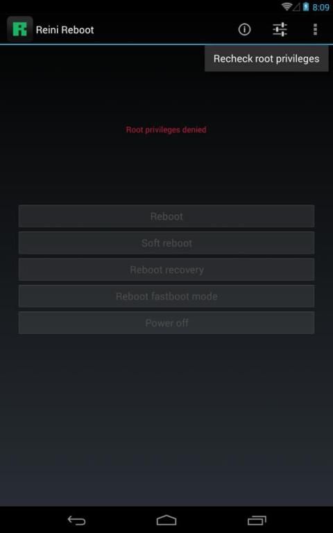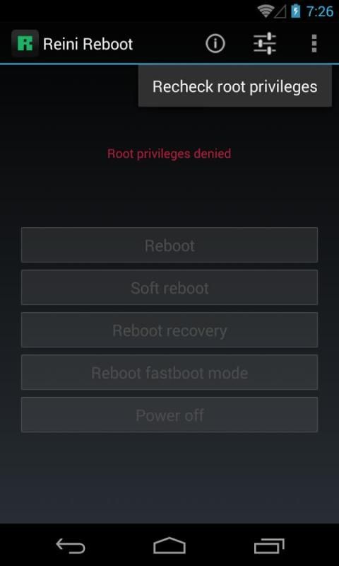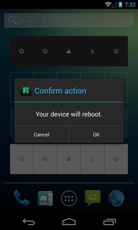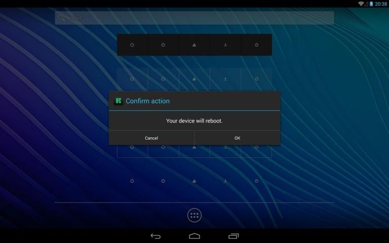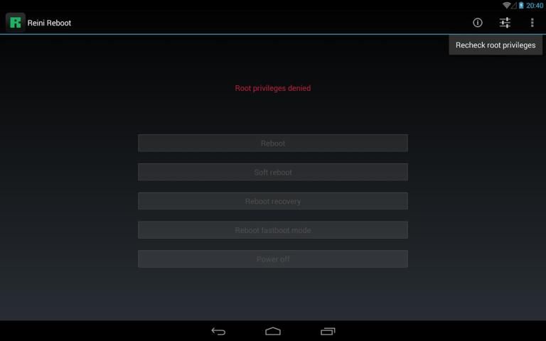 Если приложение не будет перезагрузить устройство в восстановлении, тик 'Используйте BusyBox "функцию в меню Настройки. Altough основном всем приборам и ромы поддержки перезагрузка для восстановления, это может быть, что ваши devies или ROM нет. Тип восстановления (наличие / CWM / TWRP) также влияет на функциональность.