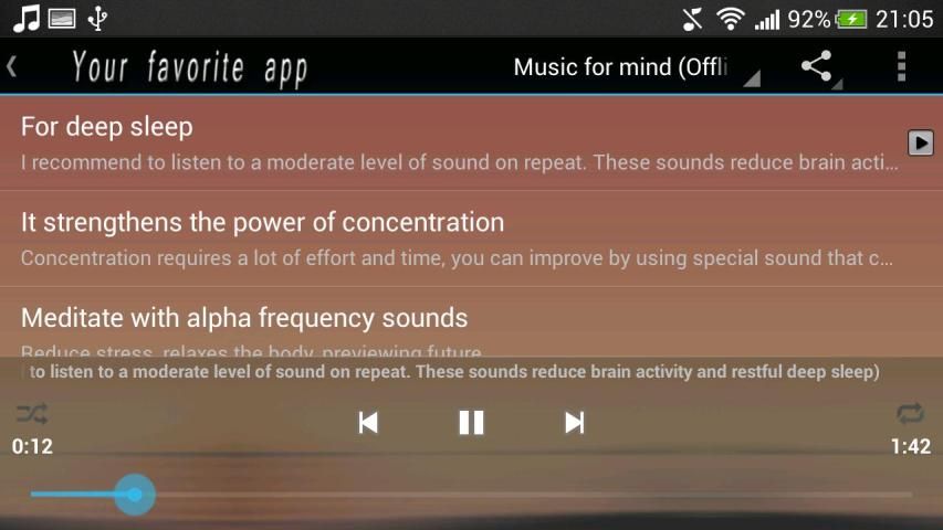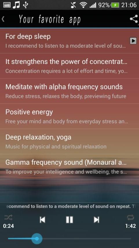 С помощью этого приложения вы будете наслаждаться высоким качеством звука, чтобы испытать тайны эндорфина, вы получите глубокий сон и отдых, и со временем вы улучшить свой образ жизни.