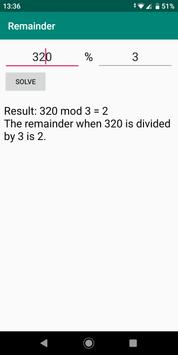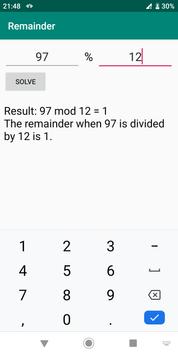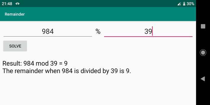 The remainder app is a simple application for calculating the modulus operation. The app helps to calculate the modulus operation and gives the result of the equation a mod b i.e. it gives the output of remainder when a is divided by b.