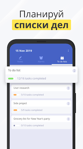 Приложение для тех, кто устал от кучи приложений на смартфоне. Одно приложение для заметок, ещё одно для будильников, одно для списков дел и, конечно, ещё одно для напоминаний. Мы думаем, что это слишком много и намного лучше иметь одно приложение с множеством функций и возможностей. 🤗