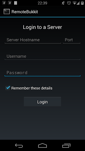 Для этого требуется серверный плагин RemoteBukkit Setup и работает на вашем Bukkit, прежде чем вы сможете использовать это приложение.Как только это установлено, просто войдите в систему с настроенными входами в систему.
