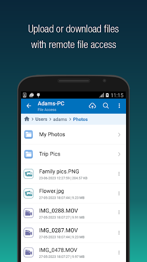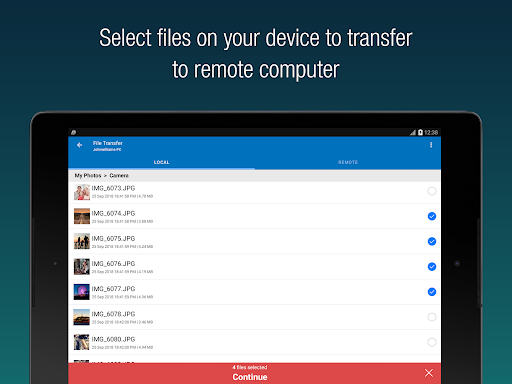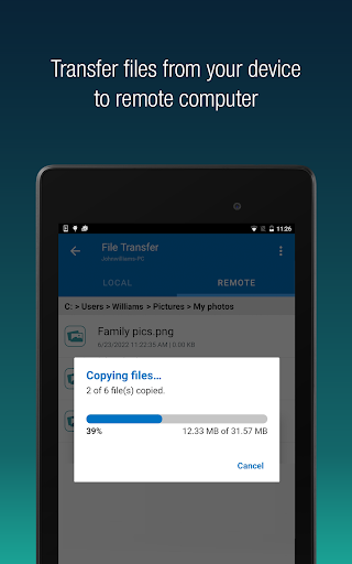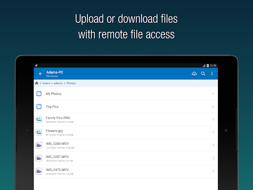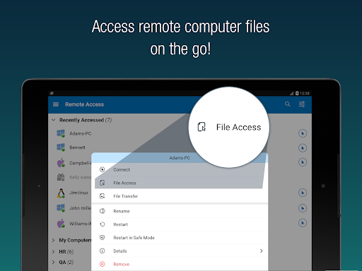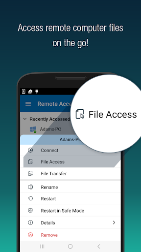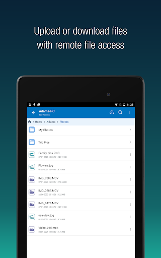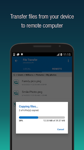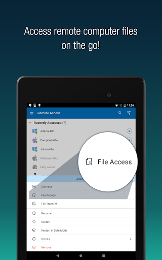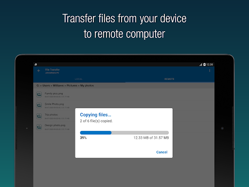 * Передача файлов через ваши устройства Android и компьютеры с/без удаленного сеанса..