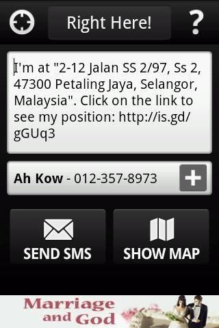 Lost in a crowd? Not sure where you are? "Right Here!" allows you to share your location through SMS. Your friends will receive a link embedded in the SMS that will launch the phone's web browser with a map of where you're currently at. Perfect for those moments when you wish to let your friends know where you are! Recent changes: Fixed a bug caused by URL shortening when receiving end view the map on a browser.