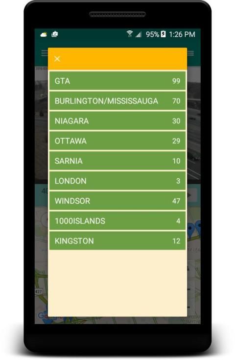 Города и районы, охватываемые в Большой Торонто, Берлингтон, Миссиссага, Ниагара, Оттава, Сарния, Лондон, Виндзор, 1000 островов, Кингстон, в том числе шоссе 401, 404, 400, 403, QEW и т.д.
