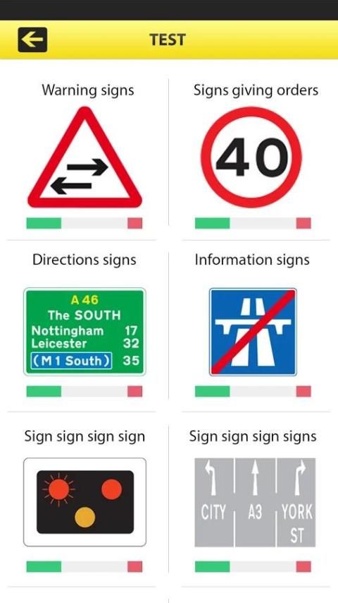 Вы можете получить доступ дорожные знаки проверить на веб-сайте: http://theory.1driver.co.uk/traffic-sign-quiz/
