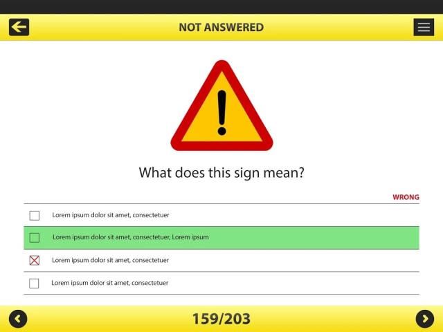 Тест информирует ли вы сделали правильный или неправильный выбор. Можно также классифицировать тестовые вопросы целевых областей, включая предупреждающие знаки, указатели, информационные знаки и маркировки транспортных средств.