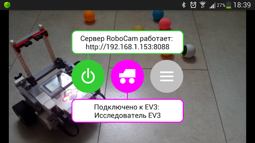 Краткая инструкция по настройке стандартного подключения. Вам понадобятся: робот EV3, Android-смартфон с установленным приложением RoboCam (далее, смартфон 1) и смартфон или планшет (Android, iOS или Windows) с современным браузером с поддержкой HTML5 (далее, смартфон 2). Android-смартфон подключается к EV3 через Bluetooth (устройства должны быть предварительно спарены!). После запуска сервера RoboCam на смартфоне 1 и подключения смартфонов 1 и 2 к одному и тому же WiFi-роутеру, можно через браузер смартфона 2 подключиться к серверу RoboCam на смартфоне 1. Для этого в браузере нужно написать адрес, который будет показан в приложении RoboCam, например, http://192.168.1.2:8088