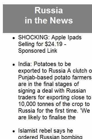 Auto-updating list of news stories about Russia. Lists news from major websites, television, newspapers, magazines.