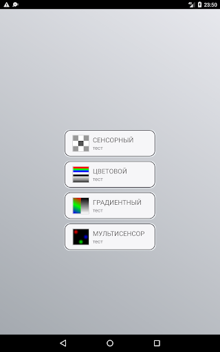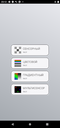 Доступны следующие тесты: тест сенсора поверхности экрана; тест цветов (красный, зеленый, синий, белый, серый, темно-серый и черный); тест градиентов (цветные и градации серого); тест мультитача мултисенсора(до 10 касаний). Спасибо, за то что используете приложение