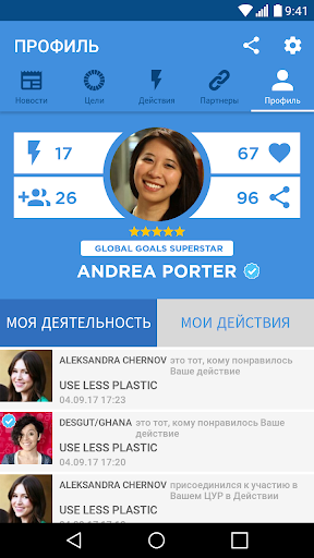 Узнайте о 17 ЦУРах, получайте новости о Ваших любимых целях, узнайте, что Вы можете сделать, и какие действия следует предпринять, чтобы помочь в их достижении; создавайте собственные события и акции, пригласите других людей присоединиться к Вам для участия в действиях и мероприятиях по устойчивому развитию.