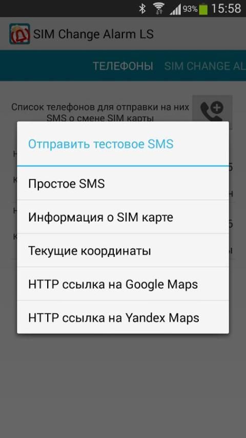 На телефоны из списка можно отправить SMS из меню для проверки работы приложения.
