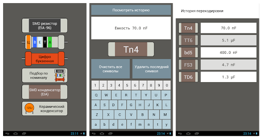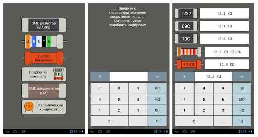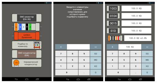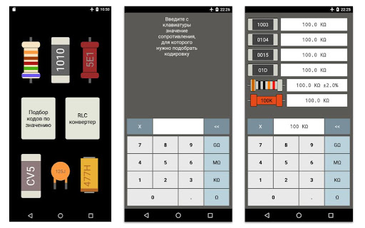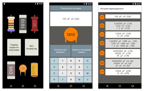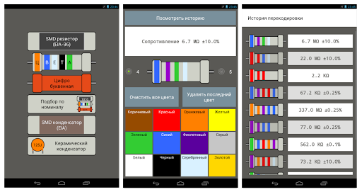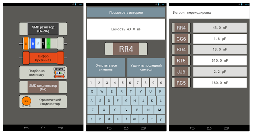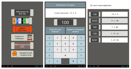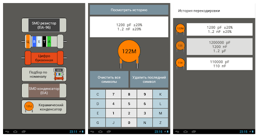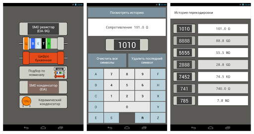 Данное приложение позволит Вам раскодировать номинал SMD элемента (сопротивление, ёмкость), а также цветовую кодировку резистора.