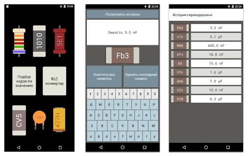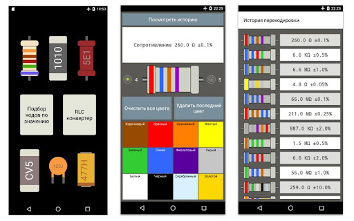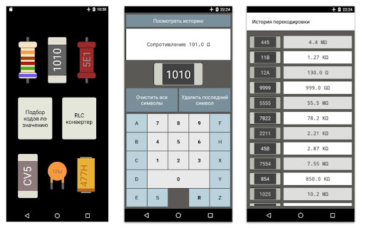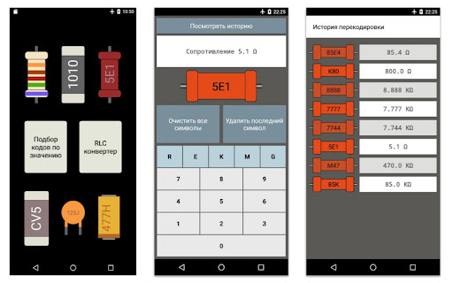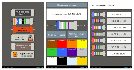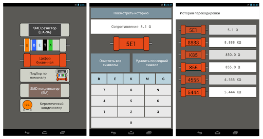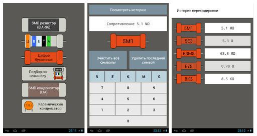 Сохраняется история расшифровок по каждому элементу и обратная конвертация сопротивлений - Вы вводите сопротивление и приложение подбирает SMD-кодировку и цветную кодировку.