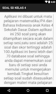 Soal Kelas SD 4 merupakan aplikasi yang berisi latihan soal mata pelajaran Matematika, bahasa Indonesia dan IPA dengan materi pembelajaran untuk Siswa Sekolah Dasar Kelas 4 baik semester 1 maupun semester 2. Dalam aplikasi ini 250 soal yang akan ditampilkan secara acak dalam setiap sesi, satu sesi adalah 25 soal dan skor tertinggi adalah 100. Dengan ini diharapkan siswa mampu terlatih dalam mengerjakan soal matematika, bahasa indonesia dan IPA.