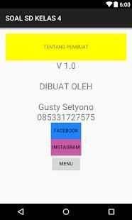 About the SD Class 4 is an application that contains exercises mathematics, Indonesian and IPA with instructional materials for Elementary School Students Grade 4 both the 1st half and half 2. In this application 250 questions that will appear randomly in each session, one session is 25 questions and the highest score is 100. the student is expected capable trained to do math, Indonesian and IPA.