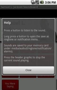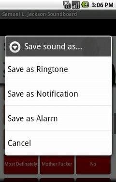 Here's a Samuel L. Jackson Soundboard consisting of over 50 quotes! You can save sounds as Ringtones, Notifications and Alarms by long pressing on a button. This app will by default install to an SD card. Enjoy! Version 1.1 Added Post Review Menu Option