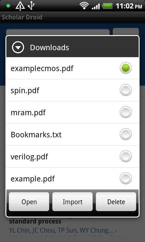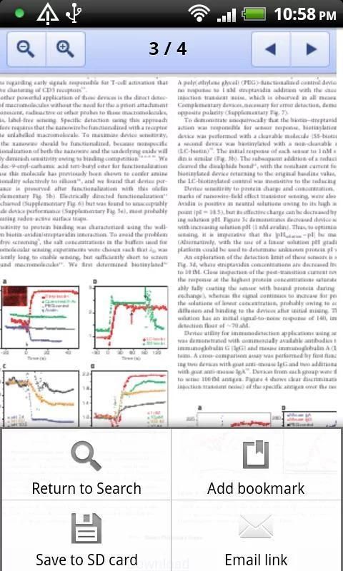 Scholar Droid is a free application that lets you conveniently browse through search results returned by Google Scholar, look up book results on Amazon, add/export/import bookmarks, view/save free PDF articles to SD card and send search result links as email.