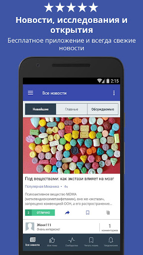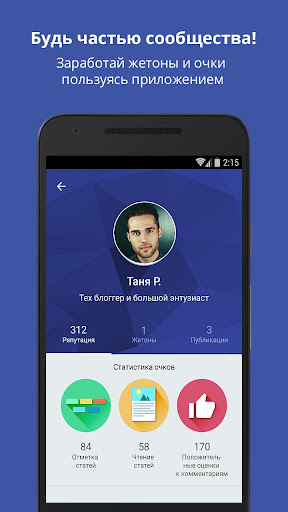 - Сообщество любителей науки! Встроенная в приложение система комментирования, возможность отмечать статьи, зарабатывать баллы репутации и жетоны!