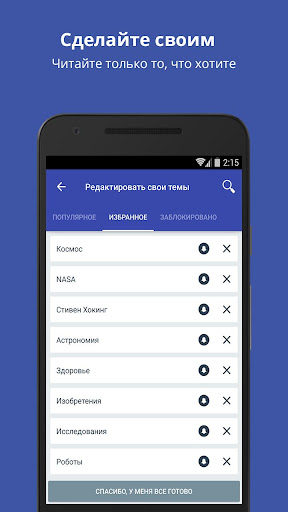 - Лента новостей, настроенная по вашим личным интересам - выбирайте темы, за которыми вы хотите следить и/или темы, которые хотите заблокировать! Не утомляйте себя неинтересными новостями! Вы даже можете заблокировать не понравившийся ресурс! (долгое касание на любой статье)