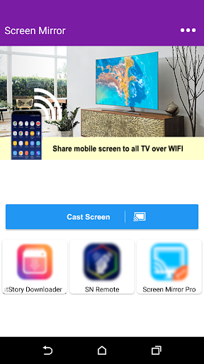Scan and mirror your android phone or tab's screen on smart TV/Display (miracast enabled ) or Wireless dongles or adapters with one click.