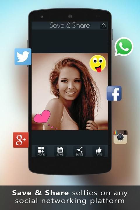 - Сохранение созданного селфи изображения на SD-карте и доли на любой социальной сетевой платформы, как: Facebook, Instagram, WhatsApp, Google+, Twitter, Beauty Circle и т.д.