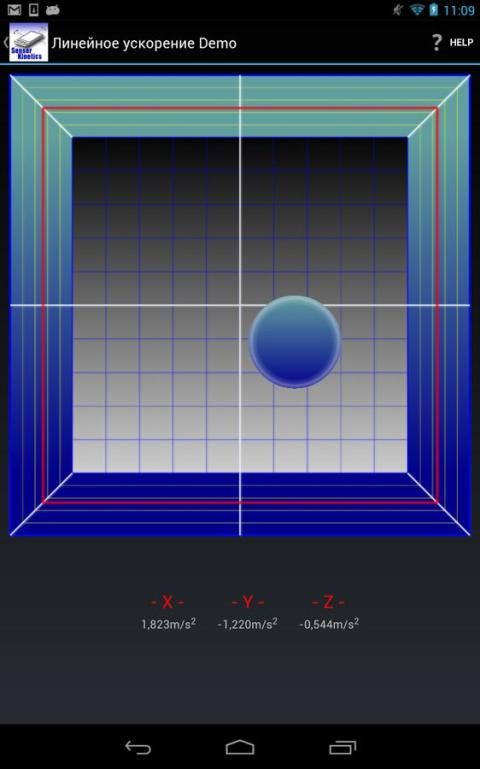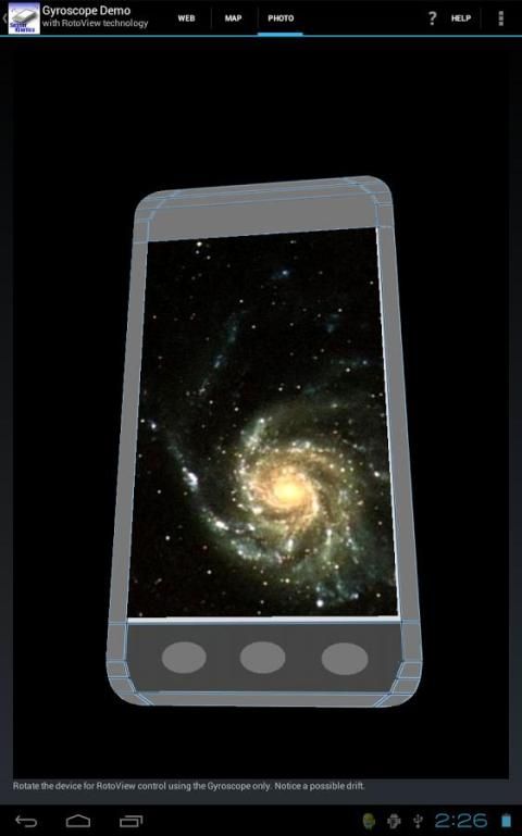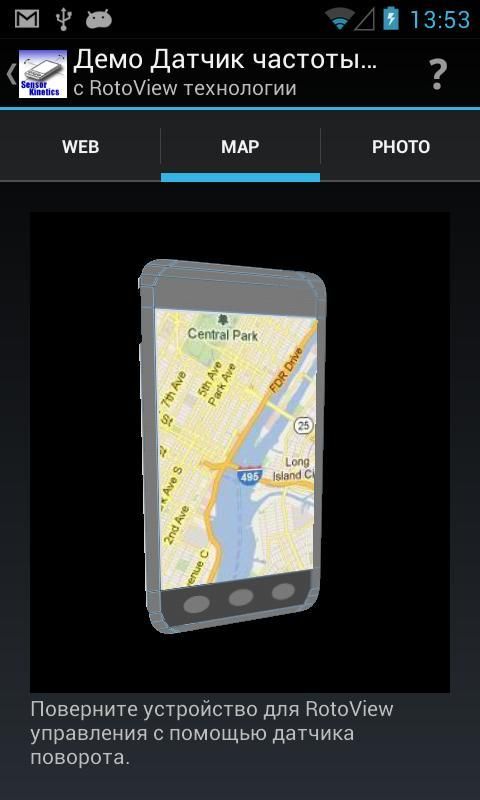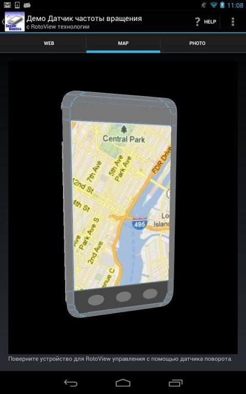 Приложение демонстрирует использование акселерометра, гироскоп и датчик вращения для контроля наклона основанный экране навигации как RotoView технологии, разработанной INNOVENTIONS. Он также демонстрирует работу магнитный датчик, линейный датчик ускорения и датчик силы тяжести в специальные графические дисплеи.