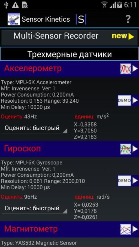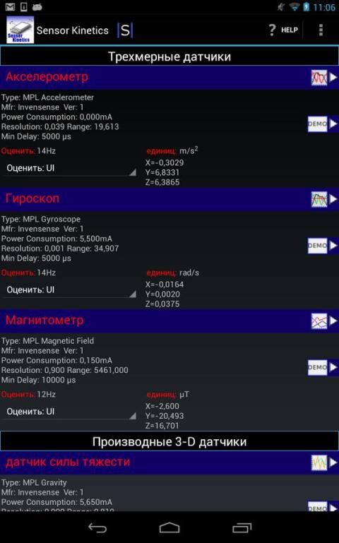 Вы можете сравнить производительность передовых датчиков, как гироскоп, датчик линейного ускорения и датчика вращения. Лучше понять поведение этих датчиков, когда вы изменяете или настройка задержки включения / отключения конкретных датчиков, а также применять расширенные возможности фильтрации.