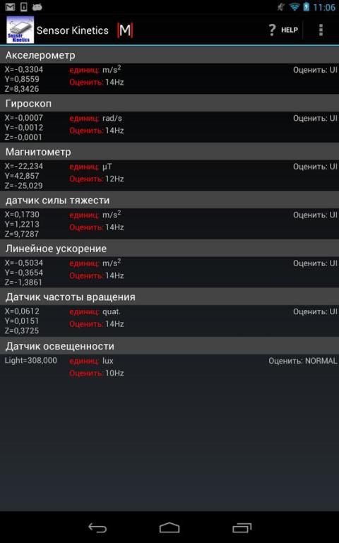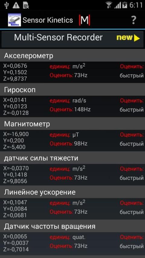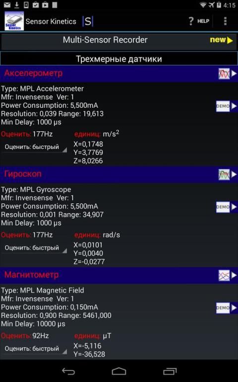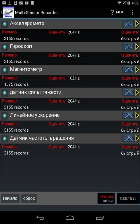 Просматривать, записывать и контролировать акселерометр, гироскоп, и все другие датчики в устройстве Android.