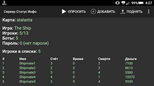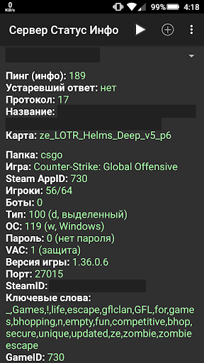 С помощью данной программы можно легко и быстро узнавать, работают ли в данный момент серверы. Незаменима в условиях отсутствия под рукой компьютера. Приложение потребляет минимальное количество трафика и может легко справляться с поставленной задачей даже при очень низкой скорости Интернета. Картинки для отображения игровых карт хранятся внутри приложения.