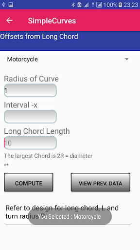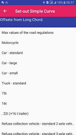 Set-out Simple Curve app allows the user to choose from various vehicle turn radii which was obtained from Neufert (1980, page 436) and simple circular curve formulas from (Raymond and Banister, page 355-356). This is a user-friendly app which the user will find to be handy while setting out curves with tapes on the field.