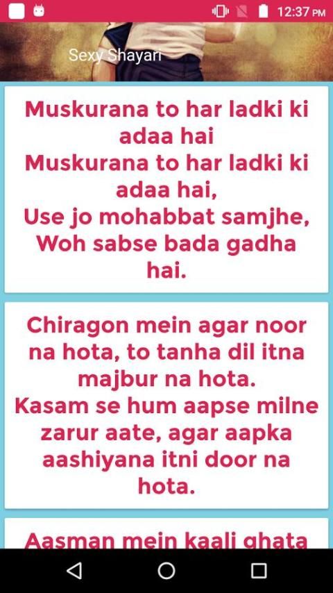 Примечание: Sexy Shayari является лучшим приложением для последнего грязного и не являющихся Век shayaries на хинди. Здесь вы найдете все типы и новейшего / Non Shayari Век для взрослых или сообщений. Взрослый Shayaries только для взрослых 18+ народов.