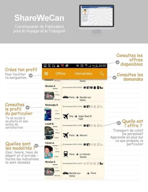 ShareWeCan представляет собой платформу для связи между пользователями, желающими помочь друг другу для достижения различных транспортных миссий и обмена.