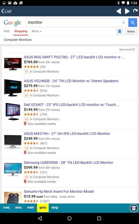 Покупатели App с Craigslist является уникальным. Просто сканировать штрих-код или тип продукта, который вы хотите, затем выберите магазинов, которые вы хотите предложения от. Покупатели App получает полные предложения от каждого магазина и отображает их в отдельных окнах, где вы можете сами просмотреть каждую и найти самую низкую цену. Никакие другие приложения дает эту важную функцию.