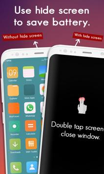 With hide screen, you can hide any ongoing screen on your phone anytime. With hide screen, you get a floating buttons on your mobile screen, clicking on the floating button a plain black screen with cover your original screen. You can use this feature to hide any of your important screen being viewed by others or use this screen to cover any ongoing activity like phone update to save battery because black screen uses low battery power.