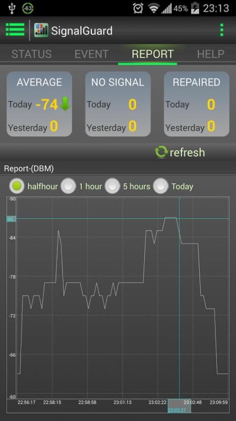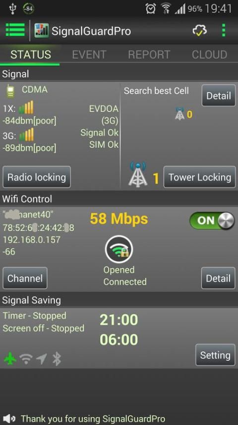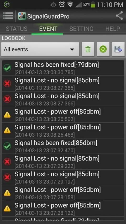 SignalGuard в режиме реального времени качество сигнала мониторинга и рабочее состояние вашего мобильного phone.It может заранее предупредить с кольцом, вибрации и LED три метода при возникновении сигнала отклонения, например, при вводе таких местах, как метро, подвал, компьютерный зал и туннели или вызванные uncorrectly настройки базовой полосы. И он может автоматически восстановить сигнал сети в течение 6 секунд (максимальная скорость), в соответствии с настройками параметров сигнала. весь процесс восстановления будет записан в базу данных, которые могут быть проверены позже.