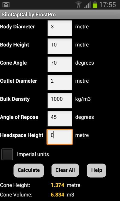 * Для расчета объема приложение требует диаметр силоса, высоту, диаметр патрубка (если плоским дном силос) и угол конуса с выходным диаметрами (для конической выходе бункера). Все не-зависимые поля могут быть пусты или установить с 0 значениями.