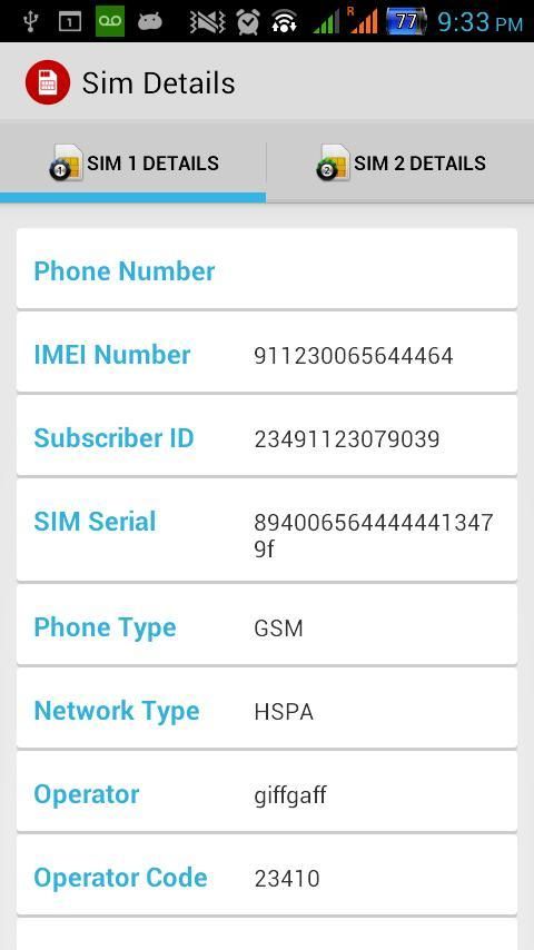 Простой и умное приложение для отображения SIM информацию, которая в противном случае не является непосредственно доступны в настройках телефона. Он поддерживает двойной SIM / Тройной SIM / Мульти SIM телефоны. SIM детали можно делиться с Facebook, электронная почта, Dropbox, PDF и т.д.