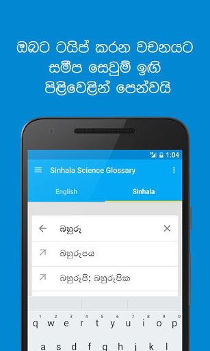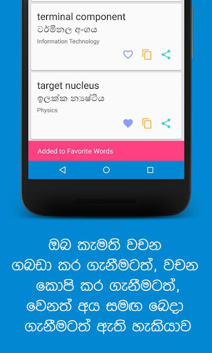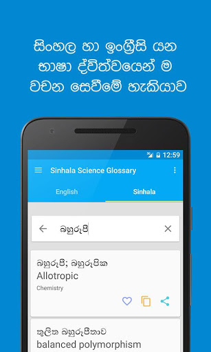 In this Sinhala – English Science Glossary mobile app, more than 90,000 words which cover all science disciplines such as Agriculture, Botany, Education, IT, Mathematics, Physics, Statistics, Chemistry, Geography, Library science,Geo Science, Computer Science, Molecular biology, Nursing and Zoology.
