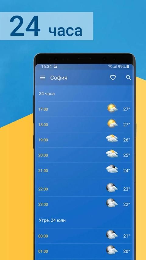 - Почасова прогноза за следващите 24 ч., с конкретни детайли за всеки час;