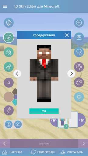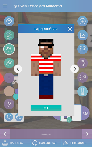 Для редактирования скина и создания требуемого внешнего вида воспользуйтесь дополнительными инструментами: ""кистью"", ""банкой с краской"", ""ластиком"" и ""палитрой"".