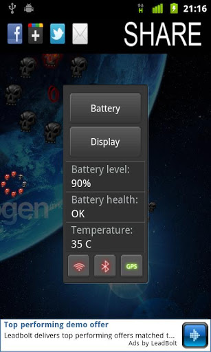 Flaming skulls showing you actual battery level. Really scary, really evil really fun. Express your self and unleash your creativity with funny battery widget This is widget you MUST add it manually to your home screen after installation.Please be aware this software is ad supported.