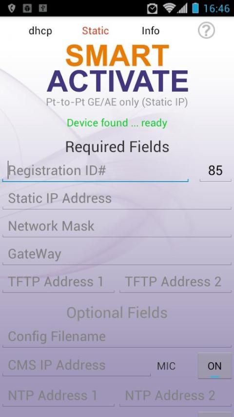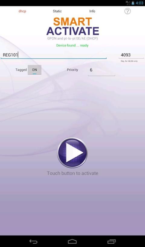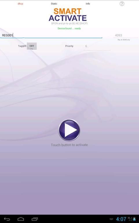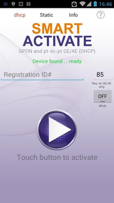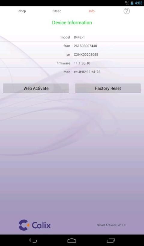 The Smart Activate apps designed to work with the Calix 7xx GE optical network terminals (ONTs) and 8xxGE residential services gateway (RSGs). Simply connect a local access point (AP) to the ONT / RSG, join the Wi-Fi network, and launch the app. The Smart Activate app will automatically find the 7xxGE ONT / 8xxGE RSG, allowing you to simply enter the registration ID and touch the activate button.