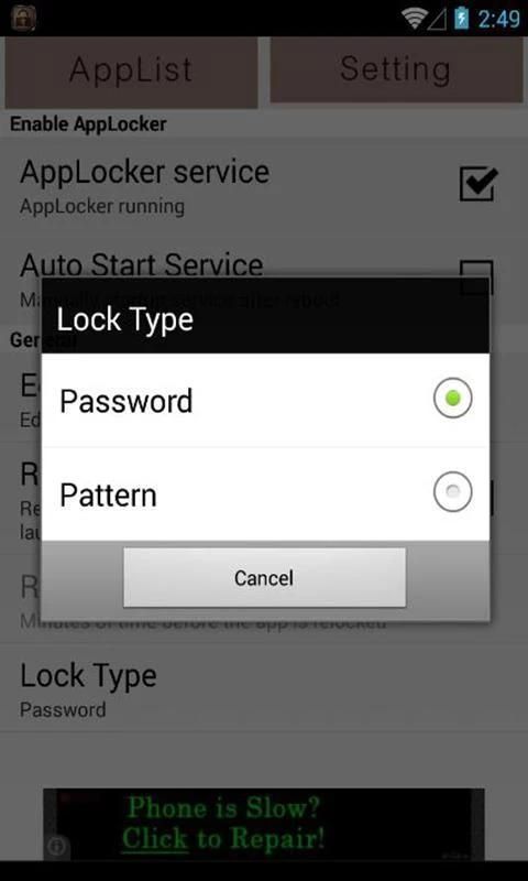 Вы можете включить или отключить службу блокировки, вы можете переключаться между текстовым паролем режиме блокировки и блокировки режиме шаблона.