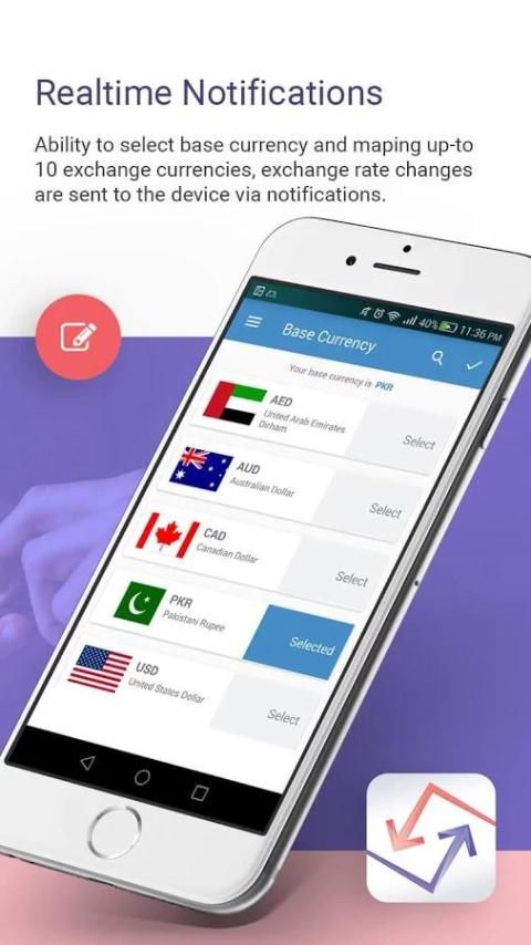 В режиме реального времени курсы валют и автономный режим экономии времени и затрат. Возможность выбора базовой валюты и картографирования вверх до 5 курсов валют, изменения обменного курса направляются на устройство с помощью уведомлений.