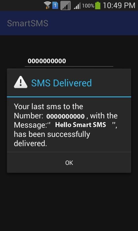 2) After delivery of the sms, a dialog box shows the number and message details of the delivered sms.
