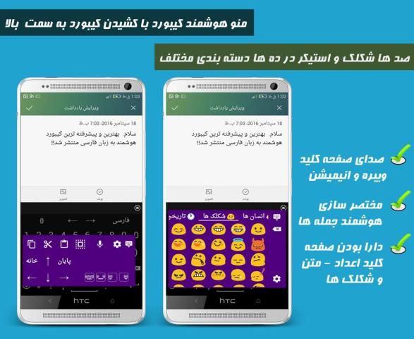 Более сотни смайликов и стикеров в различных группировках. Это приложение поддерживает несколько десятков различных конструкций, чтобы выбрать его клавиатуру, а также символ персидского и английского языков полностью поддерживаются. Интеллектуальный ввод текста является особенностью данного программного обеспечения, как появляется над клавиатурой и набрав скорость увеличивается красивая коробка. Как и все операции. Такая копия. Размещение и четкий текст с помощью всего лишь намек сделать. Программа имеет встроенный словарь, который содержит сотни предварительно определенное слова. И слово это механизм аббревиатуры, что это только первые несколько букв вы вводите полное предложение с типом кнопкой мышей предопределенного нет. Клавиатура с одной ручным интерфейсом теперь самой быстрой клавиатура