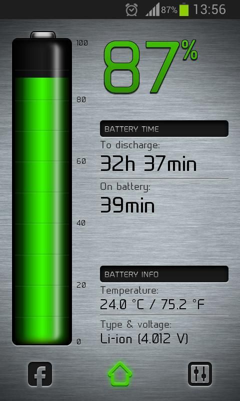 SmartBattery app is not another charge level indicator. Popular functions like displaying charging status, % charge level, remaining battery and charge time or even type, health and voltage are minor, because of... CutPower One touch solution to solve your power problems! Just place Battery widget on your desktop and then use CutPower whenever you need to enhance your battery lifetime. CutPower disables powereating functions like WiFi, Bluetooth, data transmission, synchronization and dimms the screen with only one touch. Decide which functions you want to disable. Did we mentioned it looks cool? No? Because it's not, it looks fantastic! ### Other features ### You forget to disable WiFi when not using the phone? Use WiFi disabling function, after screen locks it'll temporarly disable WiFi, until you unlock screen. Want to know exactly how much battery time you have? Battery widget will show you % battery level and estimated battery time based on your current usage. You want to be informed earlier that your battery is going down? No problem, set notifications at defined battery levels and stay informed. Want more? Look at screens. No, better - install SmartBattery and check out yourself why it's so good.