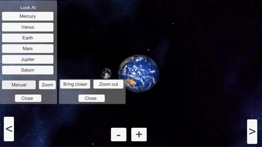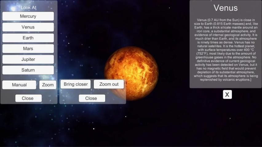 This application is a brief overview of our solar system. Moving between the major review of the planets, you can read about them, zoom in or zoom the camera, and keep track of them.