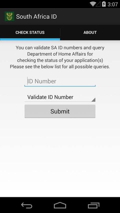 Предупреждение: Это приложение не является аффилированным лицом кафедра внутренних дел в любом случае, и не поддерживается. Если по какой-либо причине данные, полученные не отражает то, что вы ожидаете пожалуйста, проверьте его непосредственно на www.dha.gov.za который имеет соответствующие контактные данные и процедуры выполнения, если это неверно.